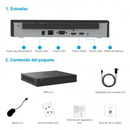 Almacenamiento: Soporta la instalación de un disco duro (HDD o SSD, no incluido) de hasta 8 TB de capacidad para grabación continua.