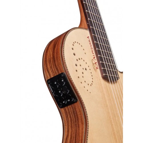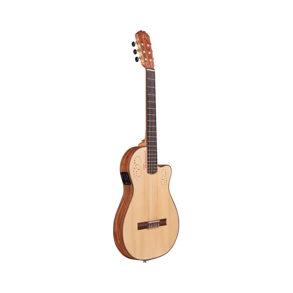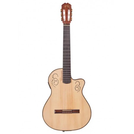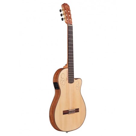 Guitarra de Construcción Artesanal con Diseño Exclusivo. Orificios Laterales en Tapa. Corte (Cutaway). Caja Angosta. Sin Boca. Excelente Sonoridad y Fina Construcción.